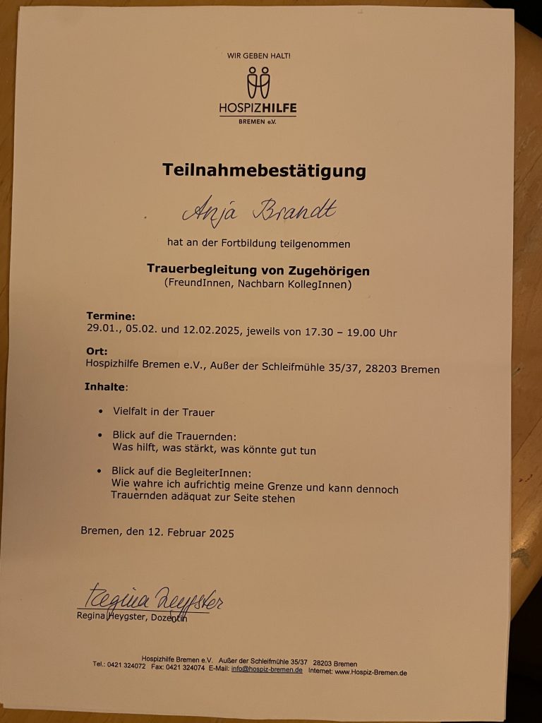 • Weiterbildung in Trauerbegleitung bei der Hospizhilfe Bremen