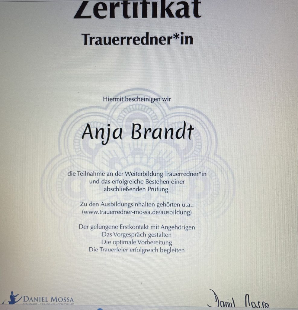 • Zertifizierte Trauerrednerin mit fundierter Ausbildung bei renommierten Trauerredner